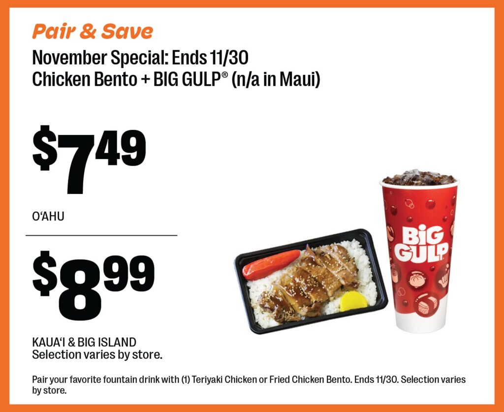 At 7-Eleven Hawaiʻi, we bring you fresh, local flavors that you love. Our menu is packed with delicious options like hot and cold sandwiches, musubi (including your favorites like SPAM® Musubi and Mochiko Chicken Jumbo Musubi), sushi, bento, and a variety of your favorite drinks like SLURPEE® and BIG GULP®.